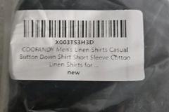 Suggested Retail: $20. COOFANDY - Mens Casual Cotton Linen Shirt - Short Sleeve Button Up Summer Beach Top This men's casual shirt features a regular fit with a cuban collar and coconut buttons. Made from high-quality cotton with a linen texture, it is lightweight and breathable for hot summer days. Suitable for a variety of occasions, it can be dressed up with suit pants or paired with shorts for a casual look. The shirt includes a left chest patch pocket, adding both functionality and style. Brand: COOFANDY. [Reference: XuAFUEB962uIMPqHgKFAob]. LOT STICKER: OH001.03-00000027-36. Type: Regular. Gender: male. Size: M. 7 CALENDAR DAY FULL REFUND GUARANTEE (FROM PRIMARY PICKUP DATE) ON THIS ITEM IF ANY ISSUE IS FOUND THAT WAS NOT DESCRIBED/PICTURED. 7 CALENDAR DAY STORAGE (FROM PRIMARY PICKUP DATE) IS ALSO AVAILABLE. THE PRIMARY PICKUP DATE IS THE DAY AFTER THE AUCTION ENDS. SEE NOTES TO BIDDER, IN AUCTION DETAILS, AT THE TOP OF PAGE 1 FOR MORE INFO.