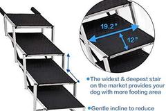 View on LOZ Suggested Retail: $145.99. Joyrally Upgraded Extra Wide Dog Car Stair for Large Dogs,Lightweight Aluminum Foldable Pet Ladder Ramp with Nonslip Surface for High Beds, Trucks, Cars and SUV, Supports up to 200 lbs,4 Steps. The handles connected with cars are covered with foam sleeves to increase the friction and the stability. They also help avoid abrasion on the ladder and the damage to your trunk. The upgraded safety tether clip to better secure the stair and keep your pet from rocking up and down. You can use this firm and durable dog ladder with 100% reassure.. 7 CALENDAR DAY FULL REFUND GUARANTEE ON THIS ITEM IF ANY ISSUE IS FOUND THAT WAS NOT DESCRIBED/PICTURED. 7 CALENDAR DAY STORAGE IS ALSO AVAILABLE. SEE NOTES TO BIDDER, IN AUCTION DETAILS, AT THE TOP OF PAGE 1 FOR MORE INFO.