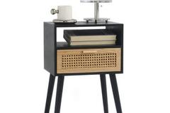 View on LOZ Suggested Retail: $86.99. MaxSmeo End Table with Storage Mid Century Nightstand with Rattan Drawer and Shelf, Wood Small Side Coffee Table for Small Space, Living Room and Bedroom, Easy Assembly (Black). Stylish and Practical Storage: The bedside table features a two-tier storage design, a unique extra top shelf and a spacious tabletop with a natural rattan drawer to fit your snug home and provide more space to put down books, snacks, drinks. Easy to assemble: The nightstand's instruction is easy to read, the process of assembling is simple and easy to follow with detailed steps. When installing the screws, Do not use Electric Screwdriver, Please screw it by manually and be carefully.. 7 CALENDAR DAY FULL REFUND GUARANTEE ON THIS ITEM IF ANY ISSUE IS FOUND THAT WAS NOT DESCRIBED/PICTURED. 7 CALENDAR DAY STORAGE IS ALSO AVAILABLE. SEE NOTES TO BIDDER, IN AUCTION DETAILS, AT THE TOP OF PAGE 1 FOR MORE INFO.