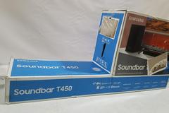 Suggested Retail:$198. SAMSUNG HW-T450 2.1ch Soundbar with Dolby Audio (2020). Impressive sound and powerful bass for an enhanced audio experience. The soundbar detects what you’re watching and automatically optimizes the sound setting for the best entertainment experience. Whether it’s a loud sporting event or a drama with quiet dialogue, you can count on Soundbar T450 to provide clear sound for enhanced TV viewing. . 7 DAY FULL REFUND GUARANTEE ON THIS ITEM IF ANY ISSUE IS FOUND THAT WAS NOT DESCRIBED/PICTURED. 7 DAY STORAGE IS ALSO AVAILABLE. SEE NOTES TO BIDDER, IN AUCTION DETAILS, AT THE TOP OF PAGE 1 FOR MORE INFO.
