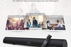 Suggested Retail:$103. Sound Bar, 100 Watt Bestisan Soundbar for TV, Wired & Wireless Bluetooth 5.0 Sound Bar(40 Inch, 6 Drivers, 105dB, Optical Cable Included, Remote Control, Bass Adjustable and Wall Mountable). Upgraded Version: High-sensitivity remote control displays the different modes by means of different colored LED lights. Deep bass, improved power (Up to 100W).Powerful bass and crystal-clear sound for all your movies, music and TV shows. Fit for 40 Inch--65 Inch Smart TV.